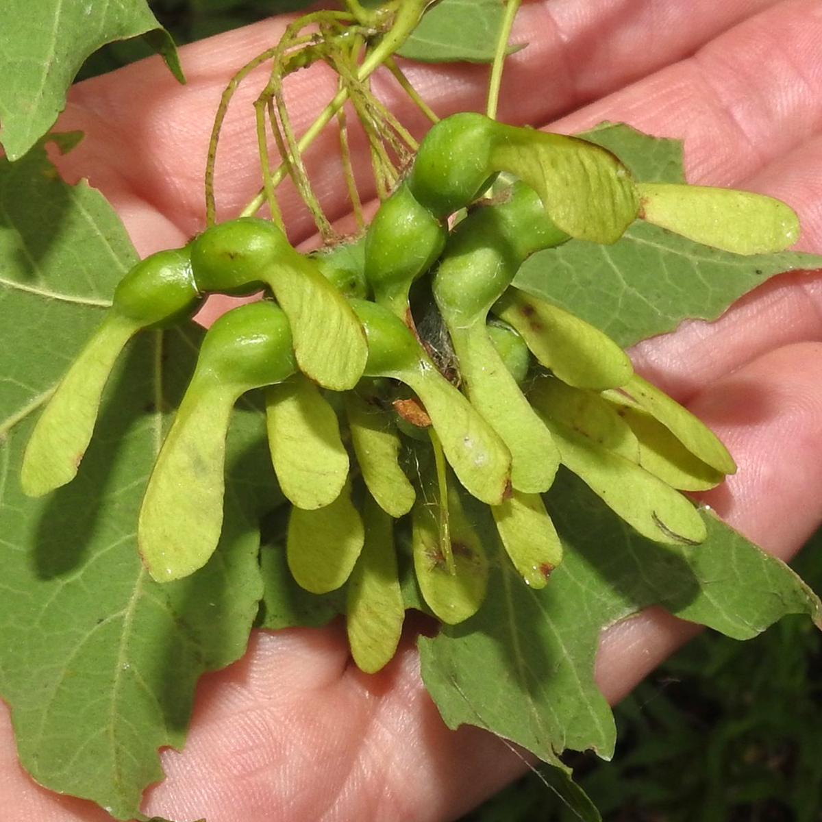 The seeds are reffered to as samara, which is a type of seed with a flatted wing that aids in dispersal. The Samara occur in double-winged, U-shaped pairs. The wings are about an inch long and diverge slightly more than a sugar maple’s. A smooth, bright red-brown seed is encased at the base of each wing.
