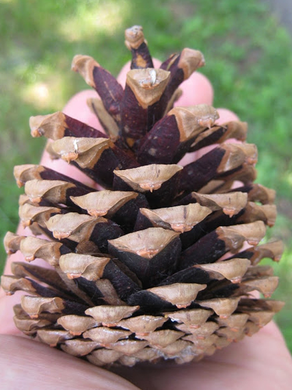 - The seed cones grow to 5-8 cm and are symmetrical. They are green when young and ripen to light brown with thick, smooth scales which end in a small, flat or blunt tip. Cones are usually singly or in pairs on short stalks, attached close to branches. The cones usually persist in the canopy through winter after the seeds have dropped.