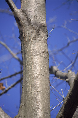 The bark is smooth and green/brown on young trees. On mature trees, the bark is brown/gray and broken into wide, flat-topped ridges with alternating bands of light and dark all the way down the tree to the lower trunk.
