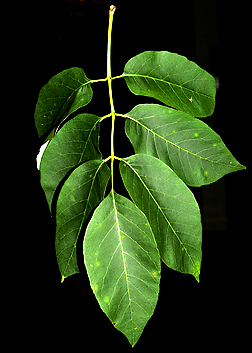 - The leaves are opposite and pinnately compound, meaning multiple leaflets are arrangd in two rows along a central stem (the rachis). Each leaf compound has 7 leaflets that are ovulate (short and circular) to somewhat lanceolate (long and narrow) and are 8-12 inches long. The leaves are hairless, green from above and paler from below.